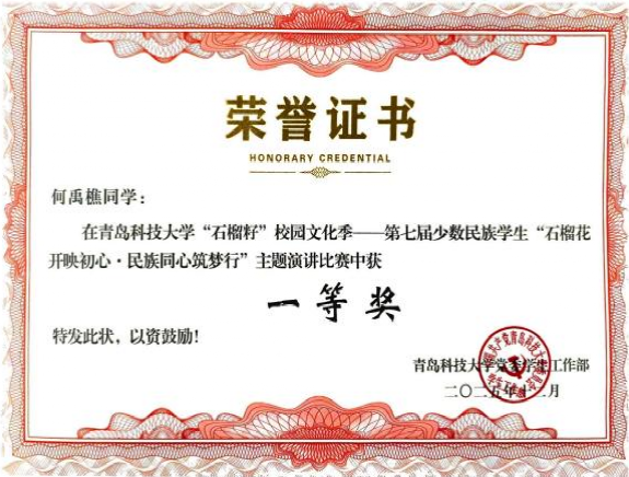 本次大赛汇聚了来自全校 17 个学院、8 个民族的 20 名优秀选手,大家同台竞技、各展风采,以演讲为桥传递民族团结的深厚情谊。经过激烈角逐与评委们的专业评审,学院机械中德 232 班满族学生何禹樵凭借出色表现脱颖而出,斩获一等奖。