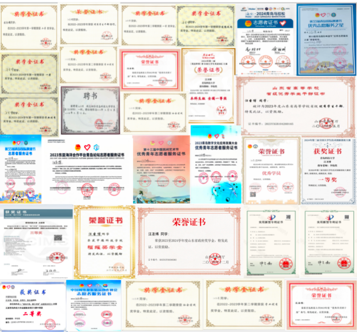为学之实,固在履践,利用课余时间他加入实验室探寻专业发展的前沿动态,走入企业工厂实习将专业知识落地转化,在学以致用的过程中不断增强自身对专业的认识,目前已发表2篇学术论文并主持山东省大学生创新创业训练计划1项。在学习与科研实习过程中,他以竞赛的方式验证对专业的理解,获国家级奖项3项,省部级奖项7项。
