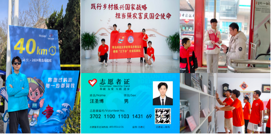 作为中国红十字会注册志愿者,大学以来他参与青岛马拉松、东亚海洋合作平台青岛论坛、青岛国际啤酒节志愿者等大型赛事会议活动志愿者7场,累计志愿服务时长超400小时,在一心为民中厚植赤子情怀。