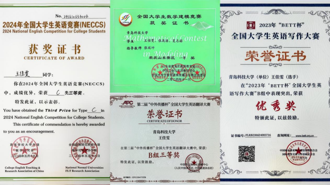 在学科竞赛方面,她表现突出,累计获得各级奖项15项,包括全国大学生数学建模竞赛省级三等奖和全国大学生英语竞赛国家级三等奖。此外,她主动投身科研实践,参与“大学生创新创业训练计划”并获国家级立项,以实际行动践行了“学思结合、知行合一”的理念。