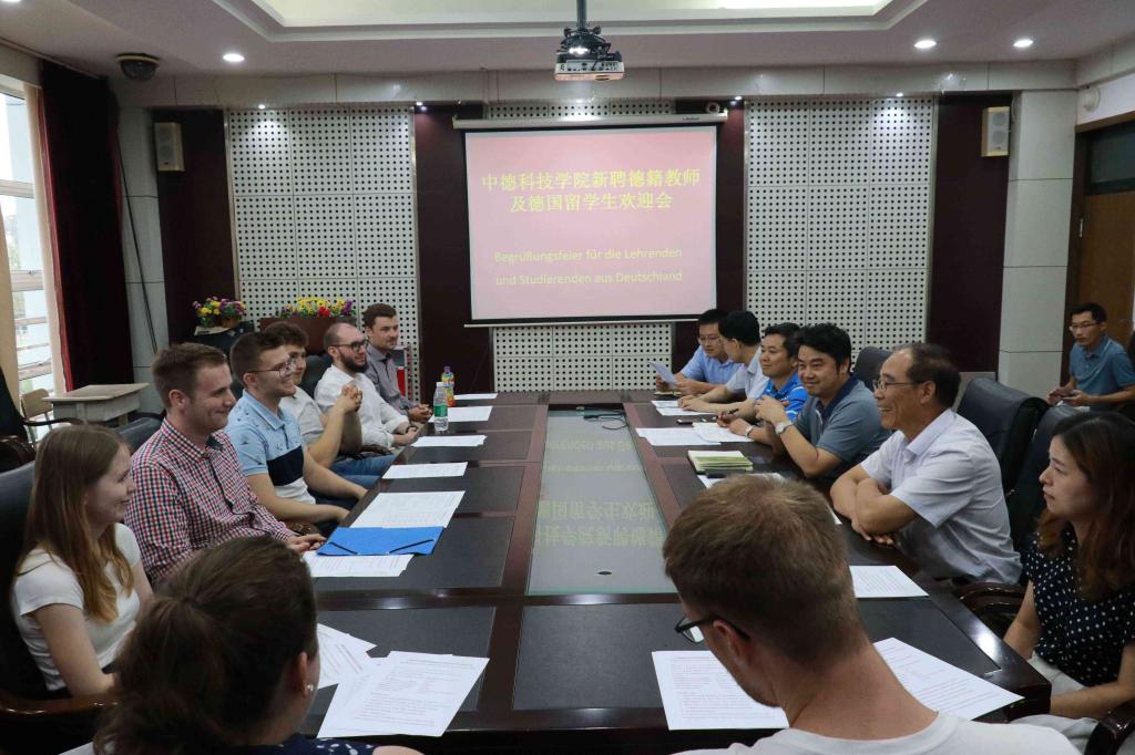 建校69周年来临暨德国留学生来校学习交流之际,为使留学生深入了解学校的发展历史,增强留学生对学校的归属感和荣誉感,9月3日下午,中德科技学院举办了“科大正青春,聚力共发展”校情校史教育暨德国留学生欢迎会,学院院长李镇江、党总支书记王江忠、副院长薄建全、德语中心副主任任铮铮、学工部部长李磊、外事部郭爱成和郑刚,14名德国助教及留学生,20名2017级受德国德意志学术交流中心(DAAD)资助赴德国交流学习学生参加了活动。