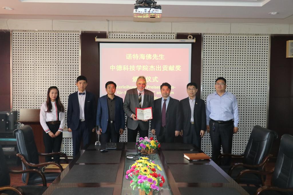 11月12日下午,Hans Nothelfer先生杰出贡献颁奖仪式在中德科技学院会议室举行,学院院长李镇江、党总支书记王江忠、副院长薄建全、特聘教授杨子江参加仪式。