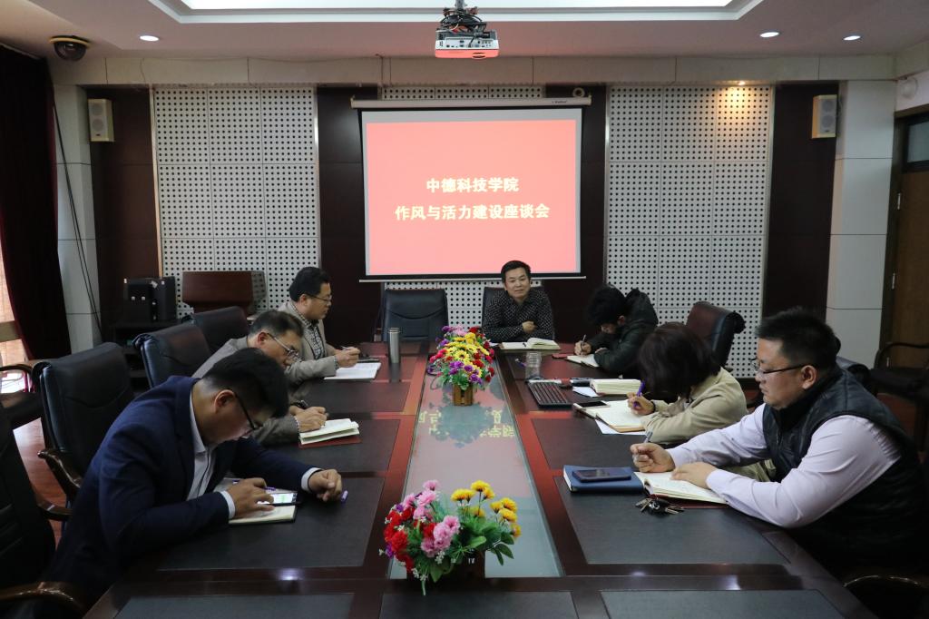 11月14日下午,中德科技学院在学院会议室开展“解放思想大讨论”推进学院作风与活力建设,党总支书记王江忠、党总支副书记王永波、副院长刘中冬参加了会议。