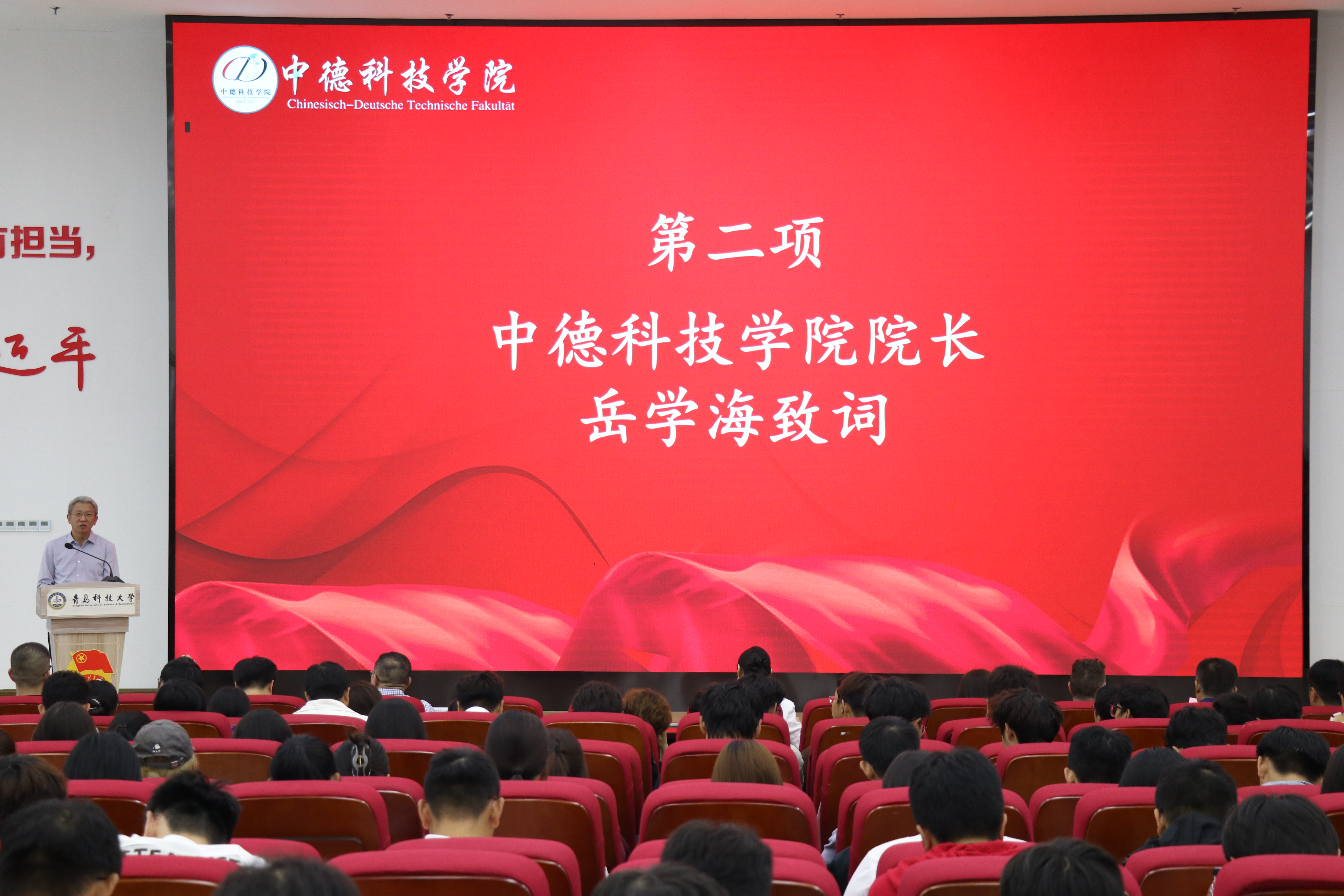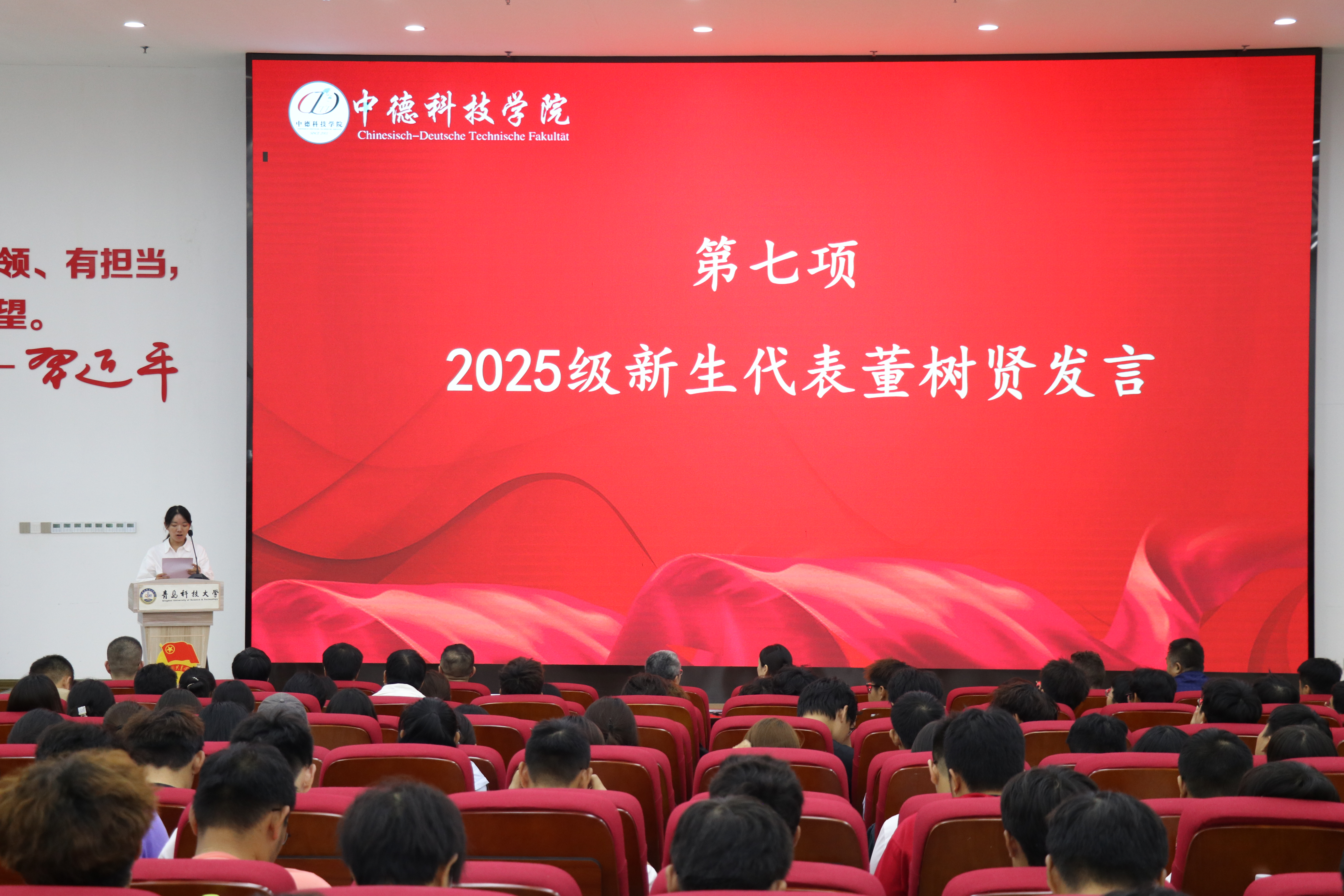 9月23日下午,中德科技学院2025级新生开学典礼暨德语等级考试成绩优异学生表彰仪式在崂山校区北苑团学报告厅举行。学院党政领导班子成员、德国锡根大学代表、教师代表以及2025级全体新生参加开学典礼。