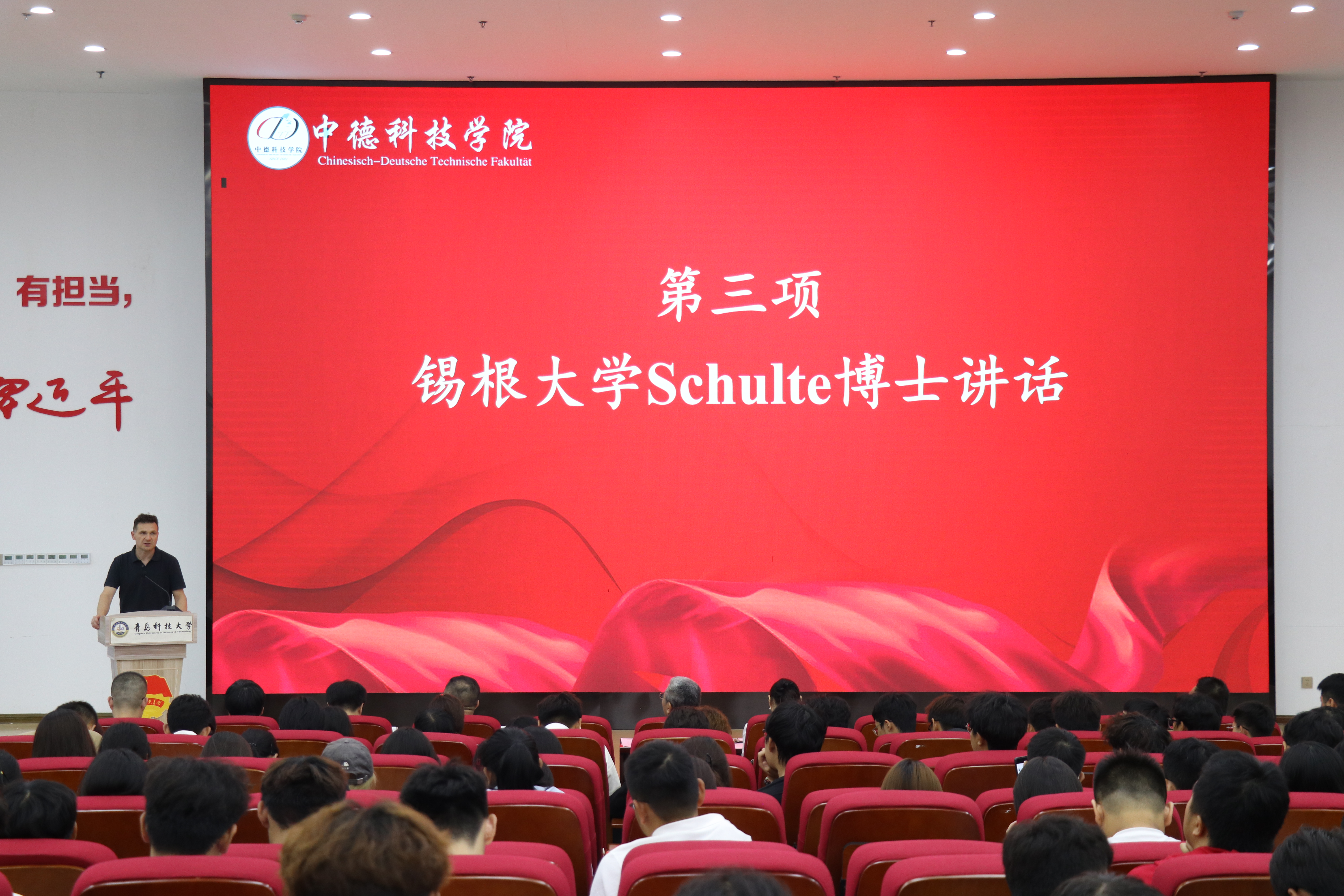 锡根大学Schulte 博士作为德方代表发言,他高度认可中德科技学院在中德教育合作中的积极作用,对双方长期以来的友好合作关系予以肯定。他指出德语是连接中德文化和学术交流的关键,并鼓励新生利用学院资源,参与交流项目,成为具有国际视野和专业能力的人才,为中德友好合作贡献力量。