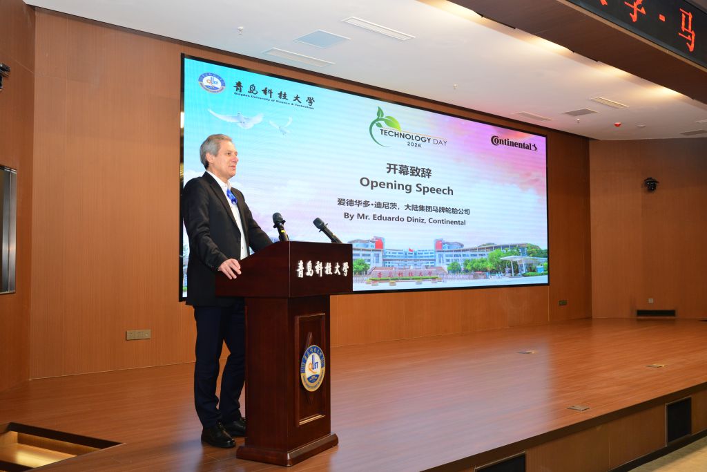 为进一步深化中德合作办学的国际化人才培养和校企协同创新优势,促进科研成果转化,2026年1月20日,德国大陆集团马牌轮胎在学校崂山校区软控学术报告厅成功举办其在华首个“科技日”活动。党委常委、副校长吴明铂、德国大陆集团全球供应商开发总监Eduardo Diniz出席活动开幕式并致辞。“科技日”活动吸引了来自德国大陆集团及其战略供应商代表、德国克劳斯塔尔工业大学、中科院兰州化学物理研究所等国内外知名研究机构的专家学者参与。